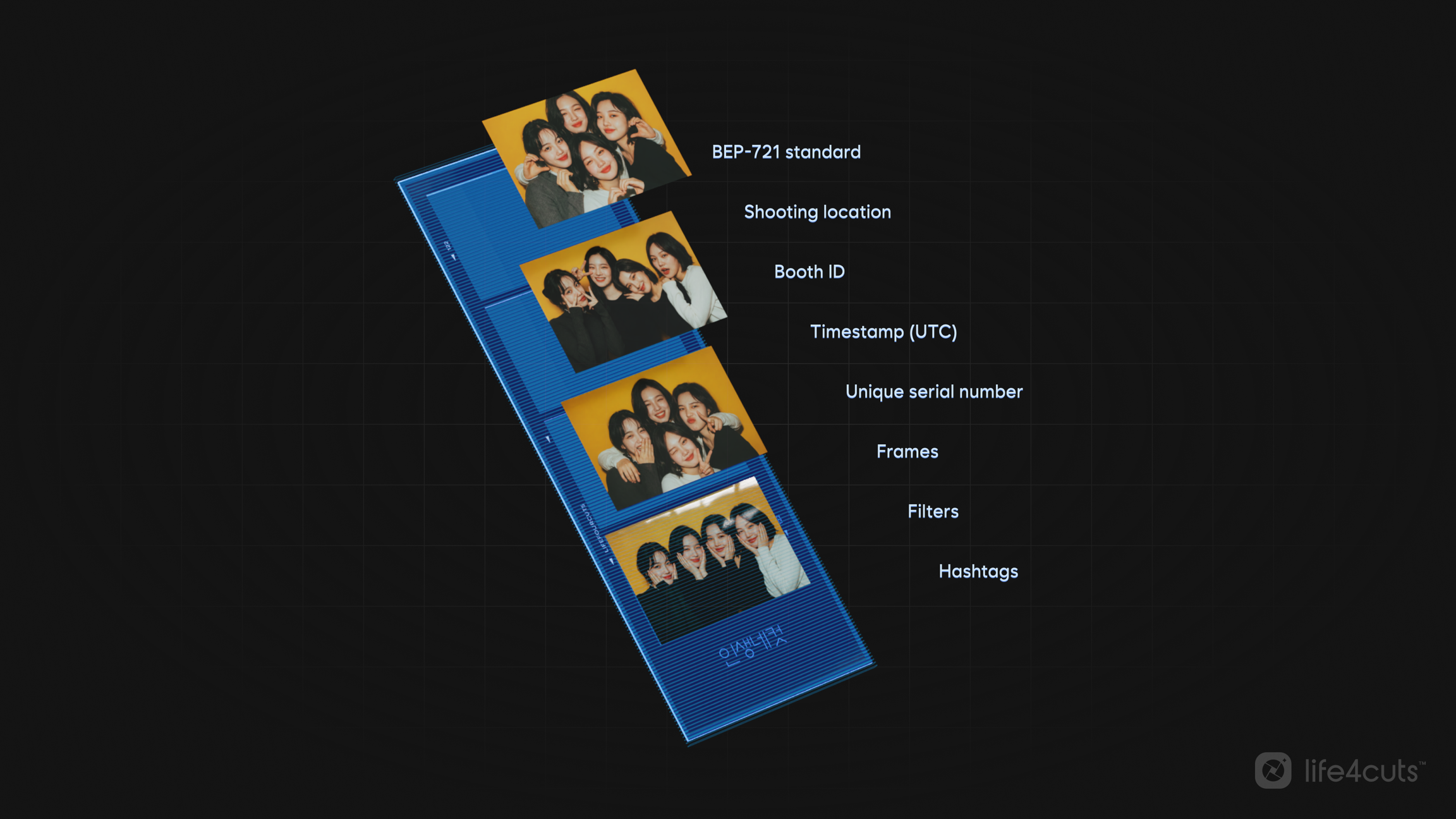 MyCUT NFTs are personalized digital assets created by converting photos taken by users at Life4Cuts photo booths on-chain. Minted on-chain under the BEP-721 standard, each NFT contains rich metadata—including shooting location, booth ID, timestamp (UTC), unique serial number, selected frames and filters, and hashtags—clearly guaranteeing ownership and uniqueness. Through MyCUT NFTs, photo-taking evolves from simple storage into “a digital asset personally created by the user,” shifting the experience toward true ownership.